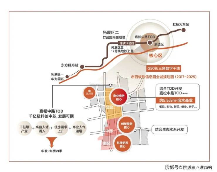 随着大虹桥科创功能西移发展的趋势,青浦新城基于“一城两翼,一带三核”发展战略目标,通过17号地铁线串联起三大核心节点,东起徐泾北斗产业基地,西到金泽华为研发基地,中部核心就是赵巷市西软件信息园,未来这条产业带上预期将会有数十万人口导入。