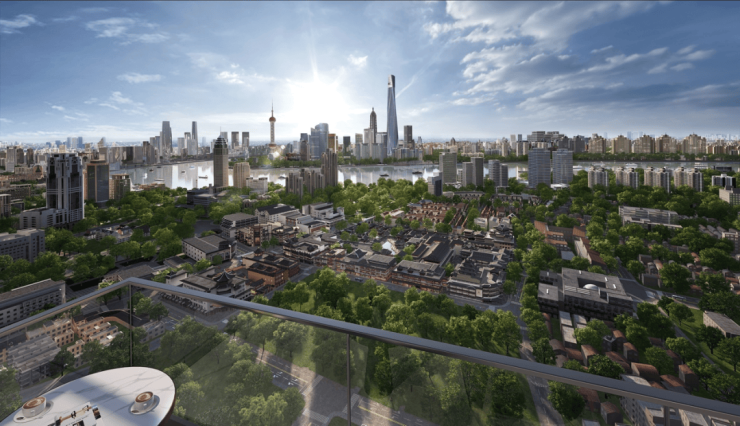 东北向对望古城公园里市中心臻贵的自然底色;南向可眺望项目自身开明里的隽永海派风貌。