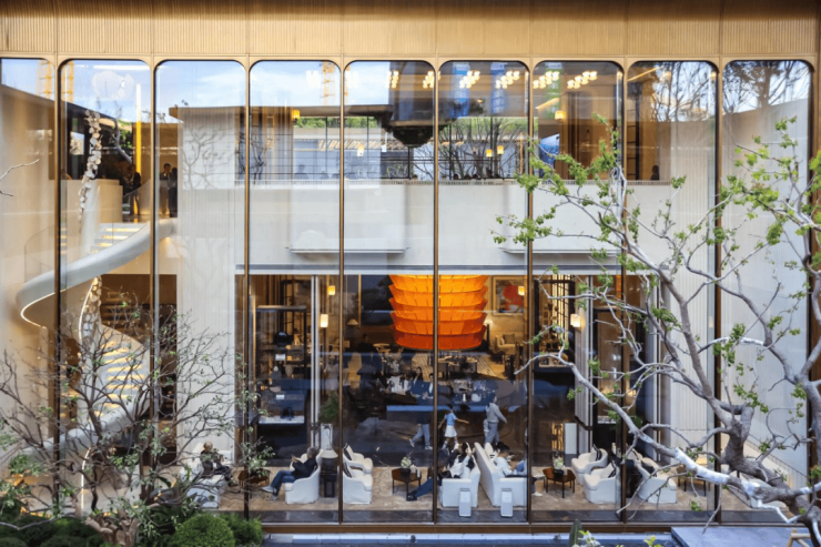 设计师巧妙利用6米高差,打造出上下联动的多维空间,下沉庭院层层叠落,绿植瀑布、景观步道与休憩平台错落交织,仿佛走进立体花园。