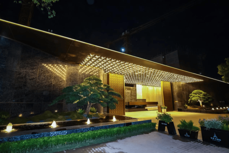 项目实体样板间和实体示范区已经开放,当看到大门的第一眼就被震惊了:约95米长西大门实景呈现,勾勒出尊贵归家的第一重仪式感。大门两侧采用乱纹黄古铜饰面,延展墙体通铺奢石大理石,低调奢华。