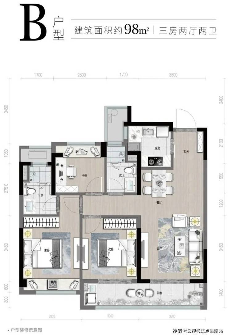 ∣江山云樾府建面约98㎡户型装修示意图