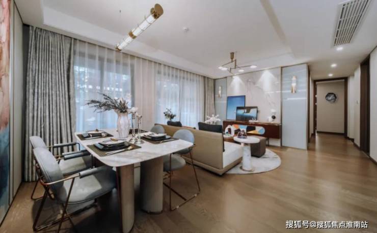 南向面宽做到了高达约9.7米。即便适逢寒秋、深冬,南侧的阳光依旧可以充分铺洒。此外,全明双卫、餐客厅一体,空间的阔敞感,一目了然。哪怕是客人到访,也会大为赞叹主人大家风度。