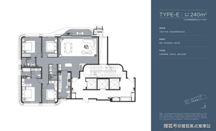 约240㎡江景四房约8.6米超宽横厅进门即见江景;约55㎡LDK一体化空间,餐厅、客厅与西厨岛台形成“社交主轴”,开阔奢朗;南北双套房配置,约30㎡南向主卧套房,集独立衣帽间、SPA卫浴、约4.3米开间睡眠区为一体,北套房4.3 米面宽搭配江景视野,即便在上海400㎡以上豪宅中也属罕见。