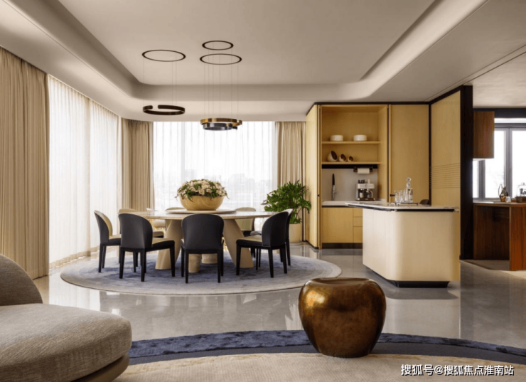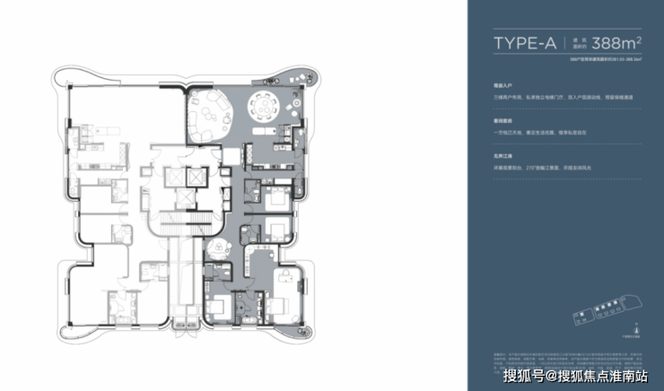 约388㎡一线江景大平层作为“藏品级”户型,约13米的惊人面宽冠绝上海,一些450㎡以上大户型,亦无如此阔绰尺度。客餐厅实际面积接近约100㎡,约3.5米轩朗层高,领先第四代住宅“国标”。南北双270°弧形转角环幕阳台,北望江景,南拥园景。3梯2户设计,双入户洄游动线,保姆动线与主人动线分离,顶豪该有的尊崇感被诠释得淋漓尽致。