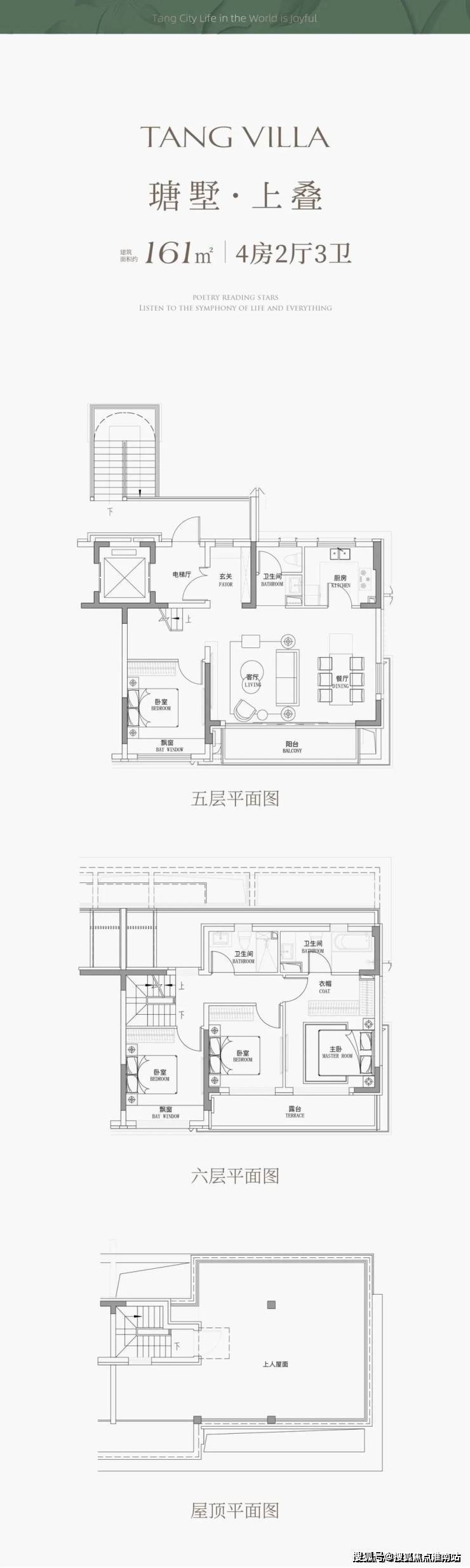 通过公共电梯五层入户,享类独立电梯厅。户型布局基本相同,5层有双联阳台,6层则设计了南向宽景大露台,搭配三开间三房朝南设计,营造尊崇的居家空间。