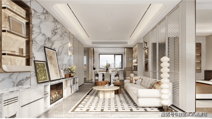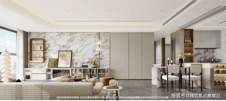 天地墙系统:宝格丽岩板、混油饰面板等搭配,地砖通铺、金属线条,匠筑现代美学空间,通透有质感。