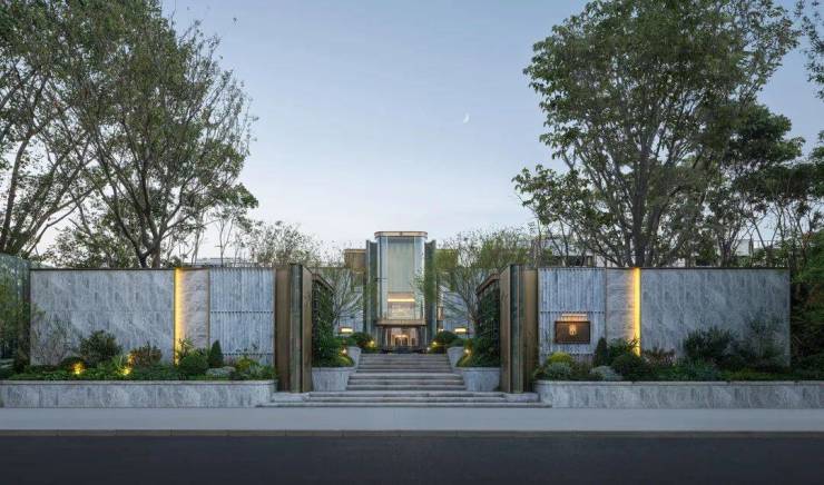 借鉴思南公馆经典的三重归家礼序,项目巧妙利用原始地形打造拥有约2米高差的归家台地,特别设计"三升九阶"的三段式台阶,寓意"步步登高、层层递进、终臻圆满"