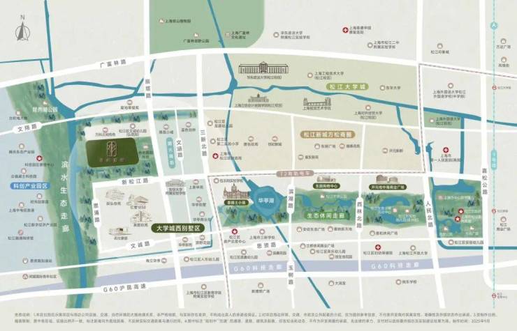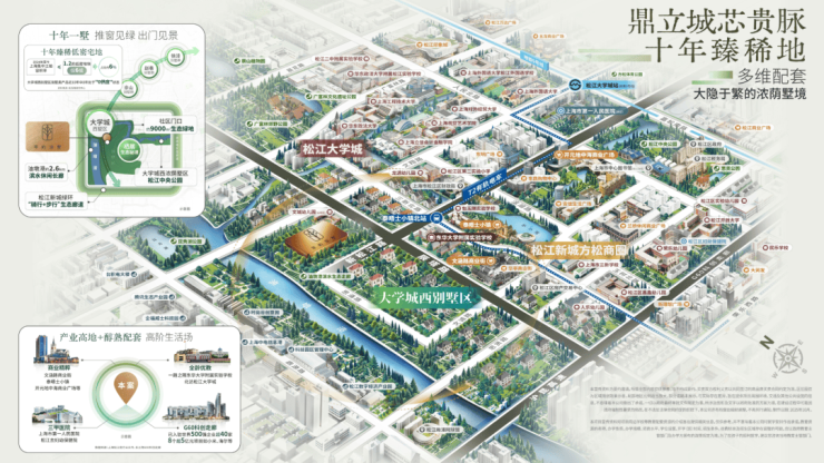 萃屿原墅所在的松江新城高端别墅区北接松江大学城,南临G60科创走廊,东靠政务金融中心,西邻油墩河谷规划,兼具成熟配套与产业动能: