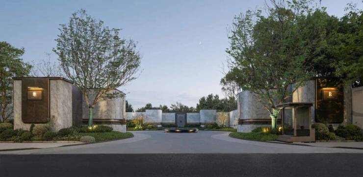 约100米长的私家礼道,两侧4米高景墙庄严夹道,整整齐齐的香樟树撑起"绿色的华盖"