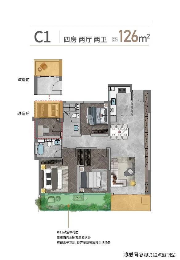 四房空间布局,无论三口之家、还是三代同堂,空间感都能悉数满足。LDKG一体化,餐、客、厨、阳台连成一体,能承载家庭成员尽可能多的自由活动空间。约18㎡套房主卧,配备全明独立卫生间,尊享私密与舒适。全明双卫干湿分离,洁净空间,让生活精致有序。约11㎡空中花园,空中种花、烧烤、养鱼全都能够实现。