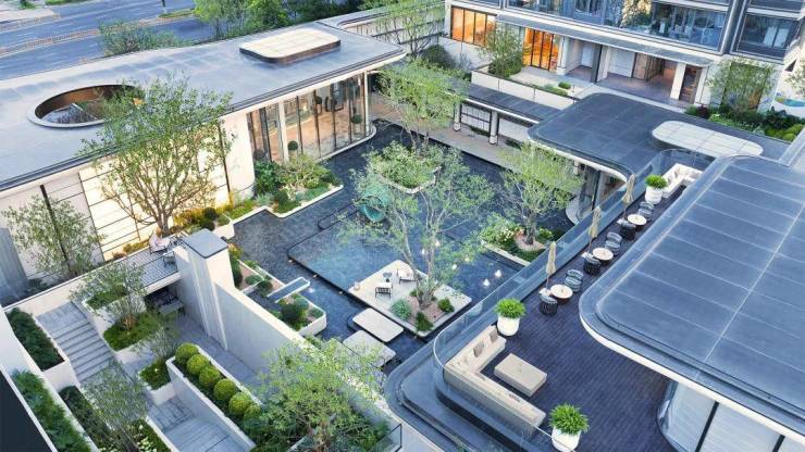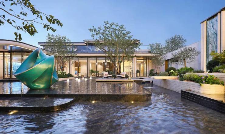 项目园林景观由蓝颂景观设计院打造,借势西侧直距约800米钱塘江的优势,引水入园,并利用公园优势,通过山景渗透,在小区铺展山水诗意画卷。
