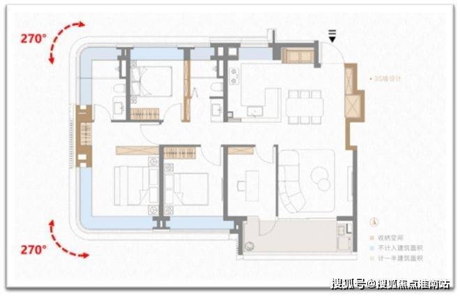 第三处山墙s墙的技术含量更高,直接让户型拥有两个大转角飘窗(主卧+主卫均双270°弧形转角飘窗)。凹处填放一个衣柜,视觉效果舒适,业主第一眼无知无觉,殊不知背后大有玄妙。