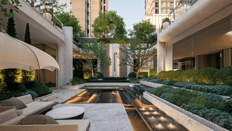 社区首层实现 3.3-7米挑高架空 ,形成悬浮于园林之上的“空中花园平台”,并打造约200米 全域风雨连廊 ,串联5座主题花园与7处景观节点。