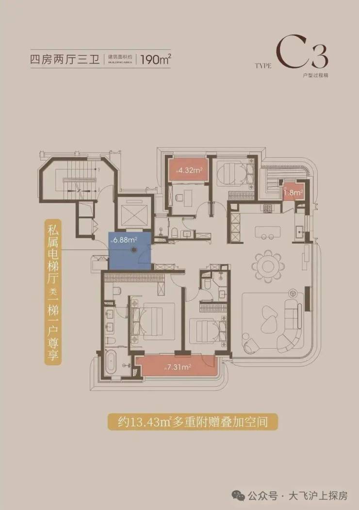 同时,这个户型拥有一个好户型应该有的所有特质:一梯一户、三阳台、主卧豪华套房、中西双厨...妥妥的终极改善产品。