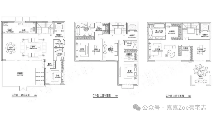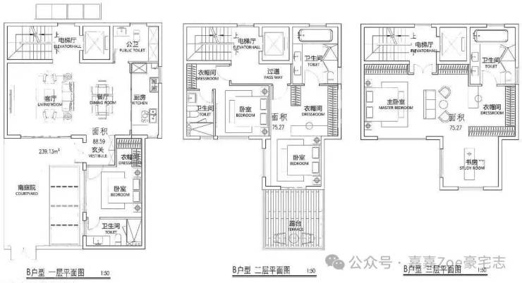 二楼双套房设计,三楼主人套房设计,开放式书房空间,通往露台。