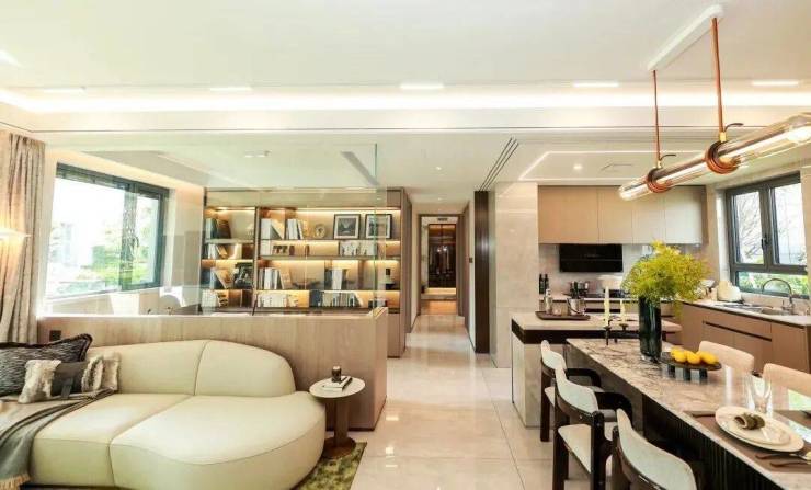 在保利·海上瑧悦的128㎡户型设计中,X空间的功能由业主定义,可以是书房,也可以是mini健身房、练习的琴房。原本全封闭式、独立一隅的静谧空间,也可以打破墙体的限制,成为开放式天地,与厨房、餐厅、客厅三大功能空间无界联通,诞生宽敞奢阔的家庭社交生活聚场,形成灵动自如的洄游式生活动线。