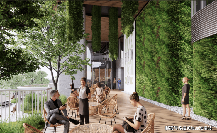 项目的食集也汲取阿姆斯特丹市集的设计灵感,在屋顶上打造天窗,在屋檐中留有特色城市观景台,在屋檐下构筑自然植物源,形成以人为中心,与绿植共处的社交空间。