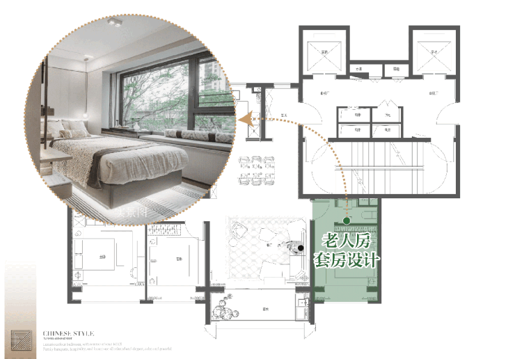 这种布局暗藏生活的巧思:LDKB的设计带来客厅- 餐厅- 厨房构成洄游动线,无界的设计打破空间隔阂提升空间的利用率;主卧、老人房与儿童房分厅而侧,实现三代同堂互不扰的居住智慧。