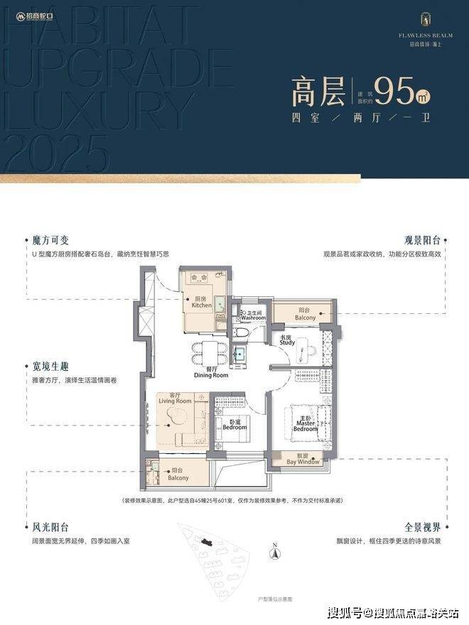 再加上南向大面宽短进深、全卧飘窗、L型转角阳台设计,哪怕小户型95㎡3房,尺度感都超棒,采光和视野更是一流。