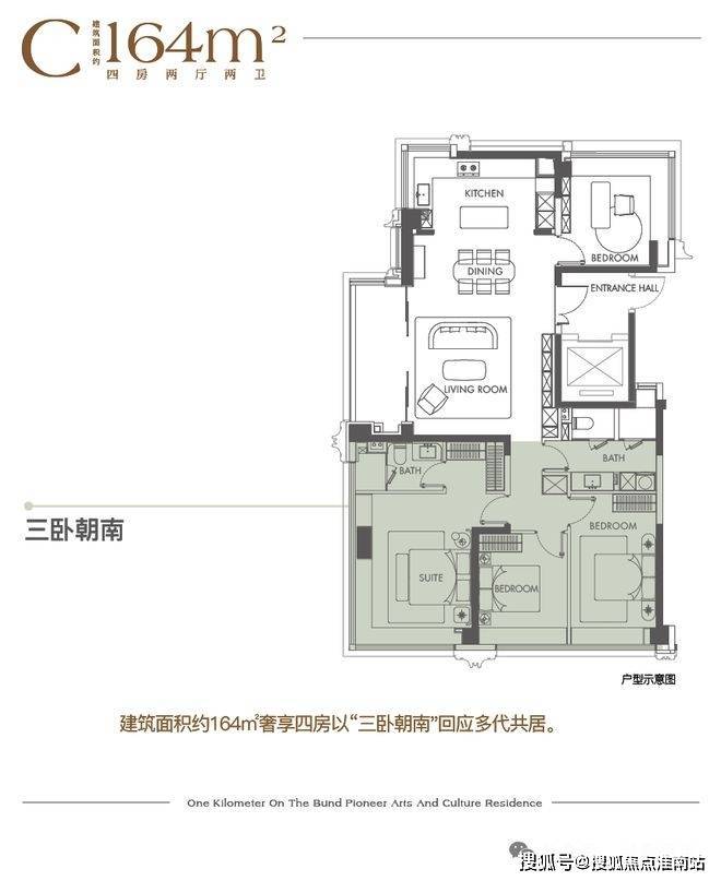 约164㎡奢享四房:内环少见的“真四房”设计,三卧朝南+环幕视野,精准契合改善家庭的核心诉求。