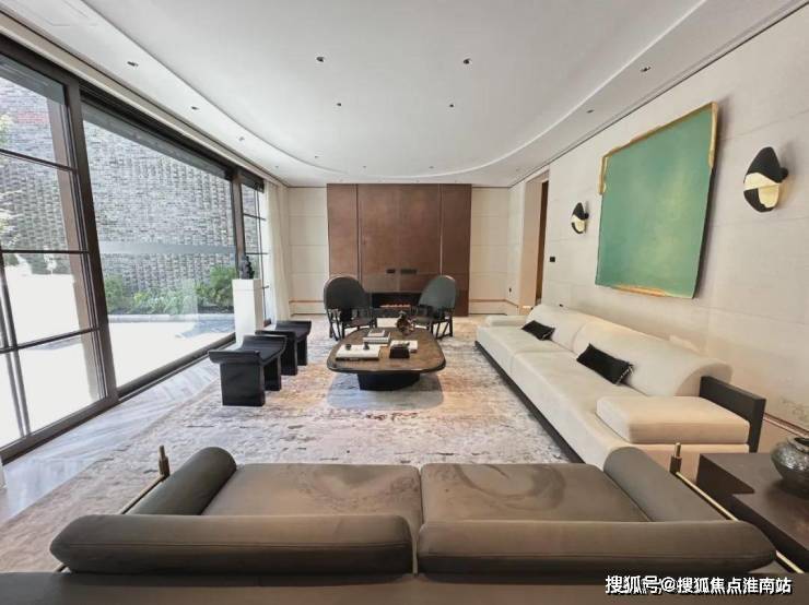 整个泳池天花板,呈现出海派拱形元素,落地玻璃窗外,是下沉式的景观空间: