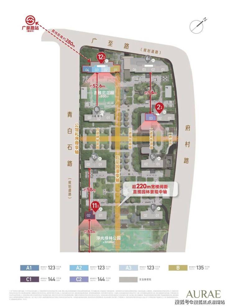 整体规划中,纵向中央绿轴超200米,横向景观轴约140米,南北楼间距约50-57米,东西间距也多超过44米,实现更好的采光通风效果与景观视野!