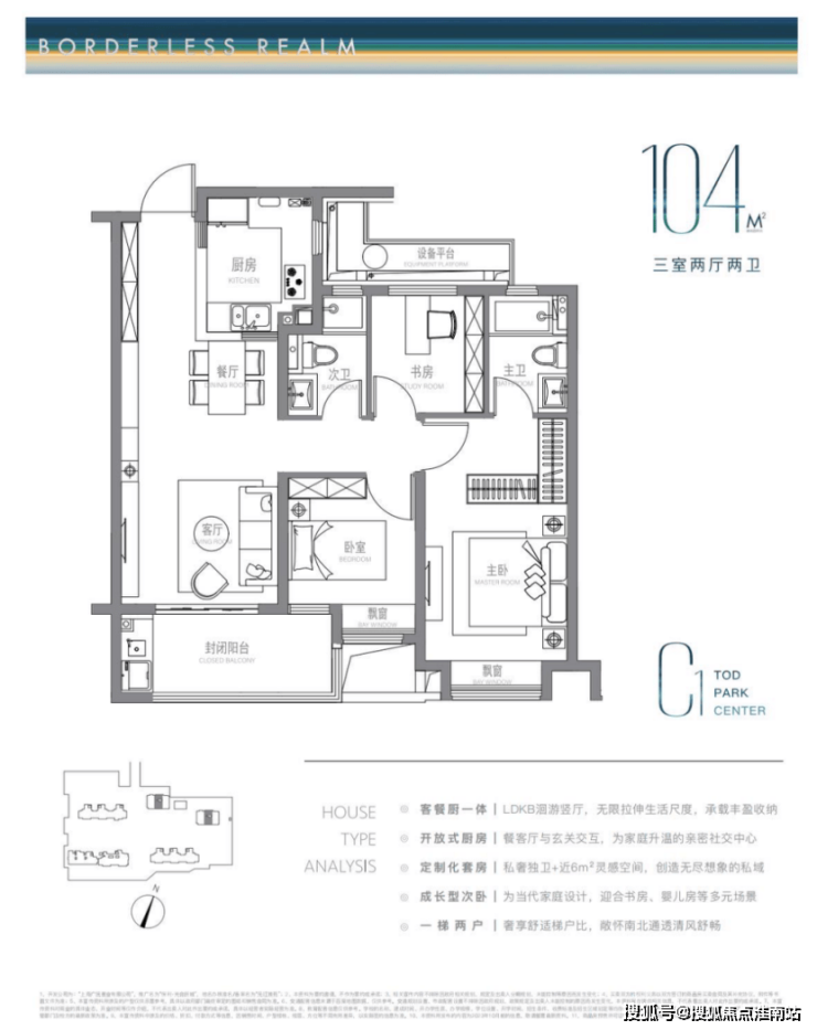 建面约104m²户型特点:LDKB洄游式竖厅+开放式厨房,生活尺度无限拉伸,主卧近6m²灵感空间,承载更多功能可能,成长型的次卧,书房儿童房随心所欲。