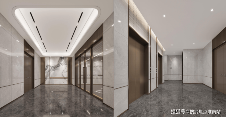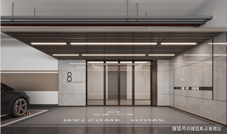 而地下车库归家,顶部灰色金属烤漆质感的格栅吊顶,配以灰色大理石瓷砖,在发光灯带的照射下,整体空间显得更加通透明亮。