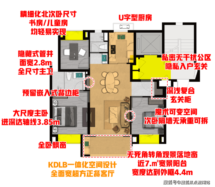 入户玄关及超大玄关柜设计,三开间朝南飞机户型,KDLB一体化设计,客厅次卧魔术可变空间,U型厨房,大尺度宽景阳台+转角观景落地窗,舒适北卧,三段式干湿分离客卫,全卧室飘窗,等等