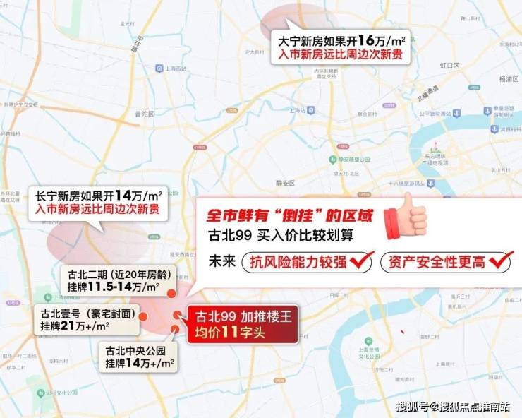 古北99售楼处电话:400-891-9910✔✔✔而古北二期近20年房龄,挂牌价11.5-14万/㎡,一街之隔的古北中央公园挂牌14万+/㎡,古北99甚至是全市鲜有存在“倒挂”的项目,资产安全性更高。