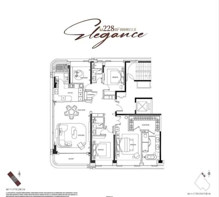高层大平层:建面约185㎡(3+1房)、228㎡(4房3卫)