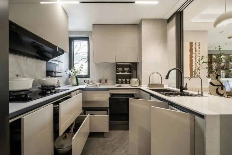 厨房定制的上柜、下柜配齐了从碗筷到厨具所有的收纳空间。