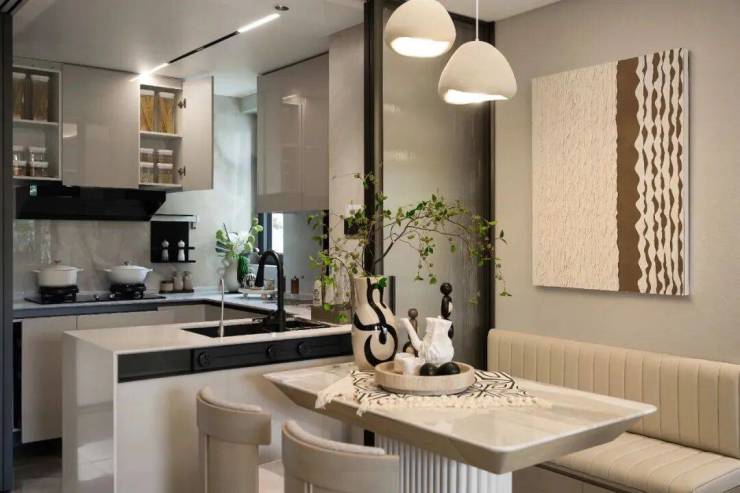 细节方面,厨房额外标配带有收纳柜体的岛台空间,轨道式插座同样是交付标准,厨房台面是和内环某10万+项目同款材料。
