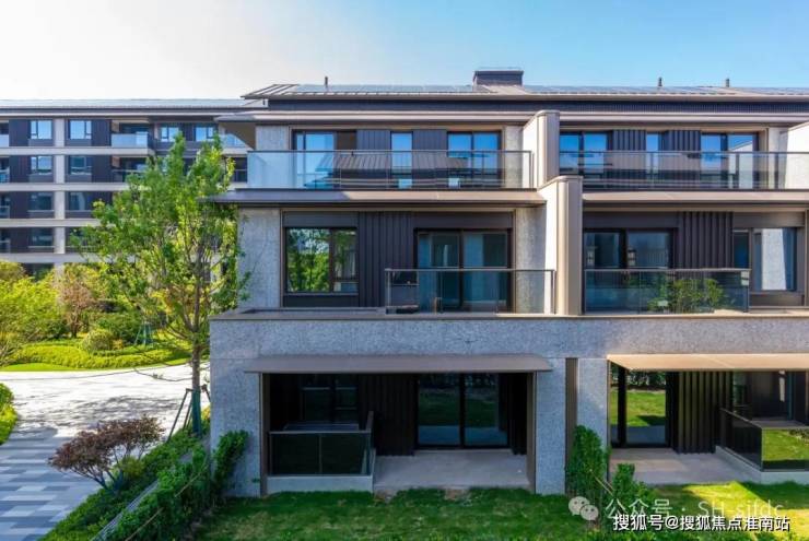 联排建筑立面上进口金钻麻石-全石材铺装搭配咖色的铝板装饰线条,不同凡响的精奢感和厚重的质感,卓尔不群,放眼整个松江,难觅雷同。