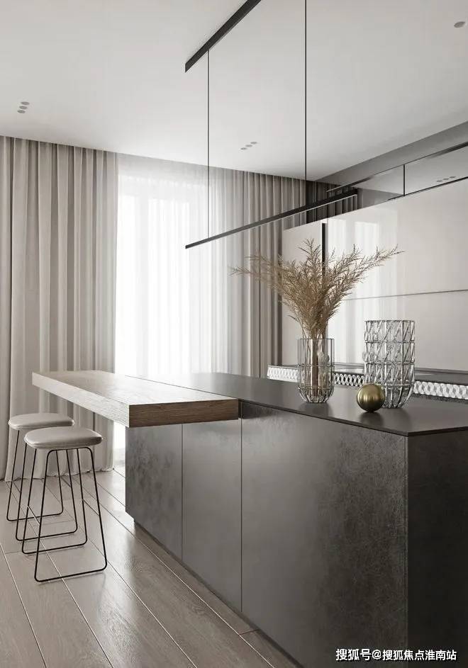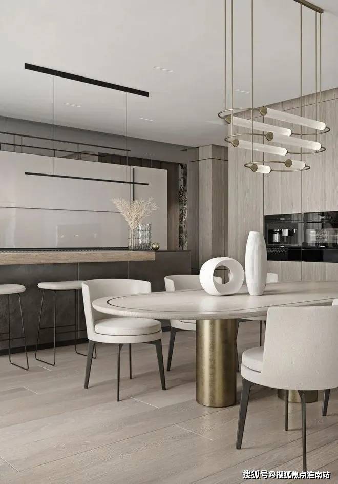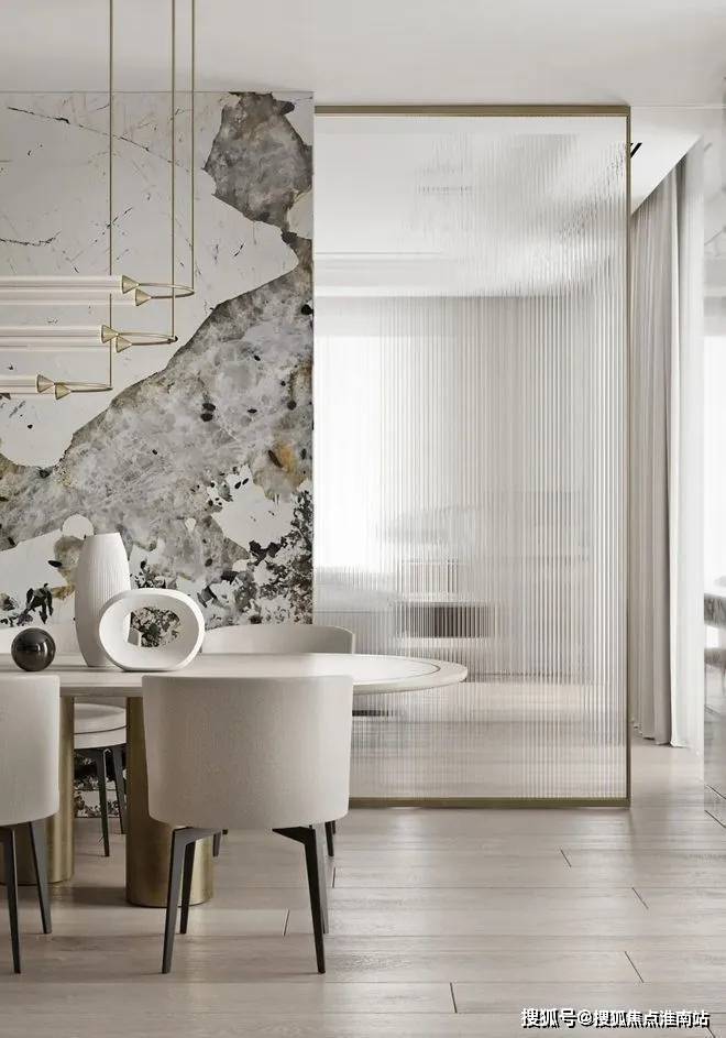 上海松江中建大椿嘉利椿廷售楼处电话☎:400-8567-334✔✔餐厅和大厅之间运用半透明屏风实现分隔,大厅光线穿过屏风赋予更美观的既视感。由金属材料打造的条状吊灯混合宽阔台面,打造更轻奢的空间气氛。