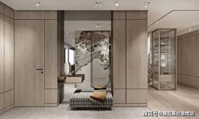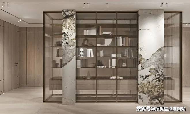 上海松江中建大椿嘉利椿廷售楼处电话☎:400-8567-334✔✔欢迎预约衣帽室设有黑金属边框的置物架,结合内侧的优雅灯带,和大理石墙隔断处理,成就整体的尊贵高级敢。