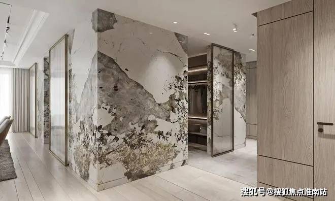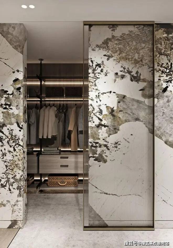 The dressing room is equipped with a storage rack with black metal borders, combined with elegant light strips on the inside and marble wall partitions, achieving a luxurious and daring overall.
