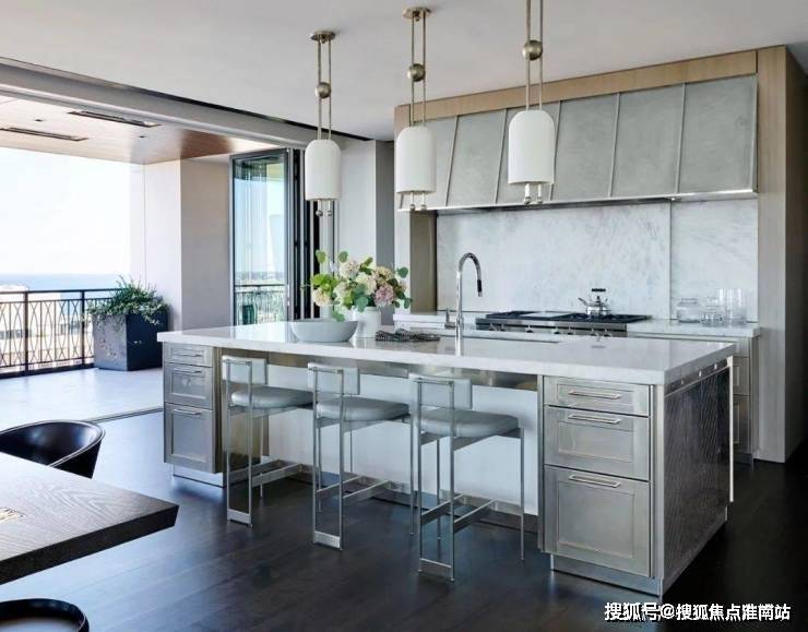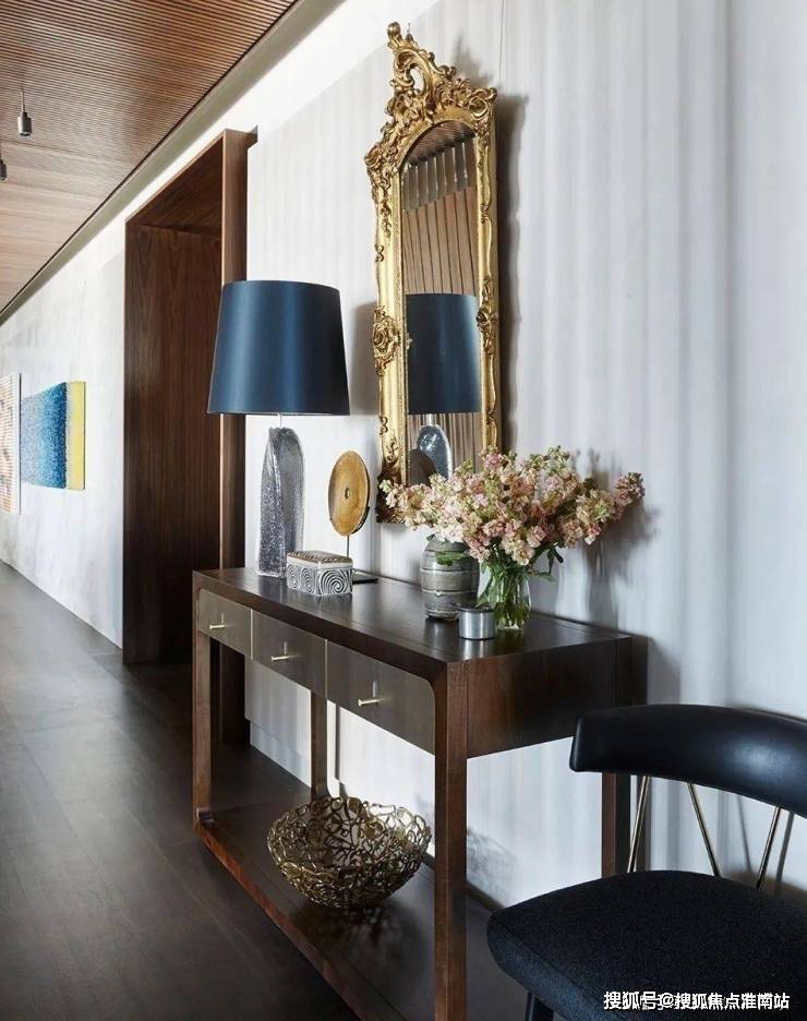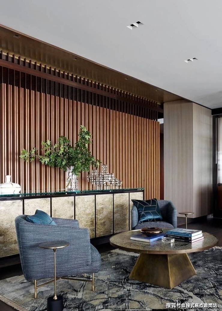 百分之百的优雅对材质的要求异常严格,而胡桃木的材质恰好强调了空间的高级感,利用老式LaVerne茶几、KellyWearstler的椅子和FortStreetStudio的地毯让人仿佛穿越回五十年代的复古时空.