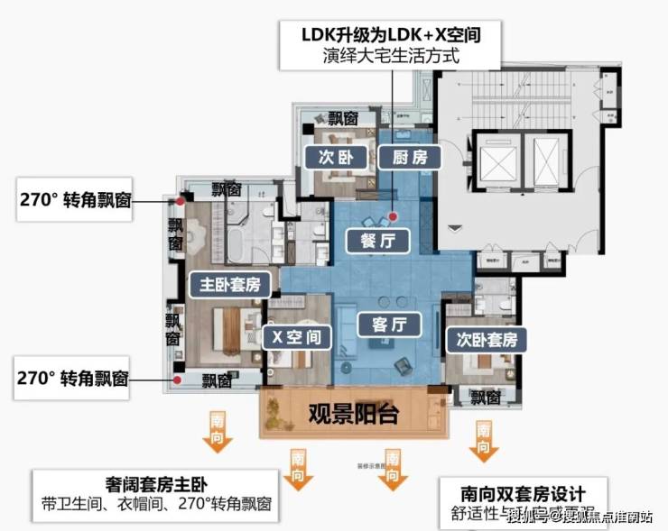采光面巨大的约8m跑道式阳台、270°大面积全面屏视野观景阳台;