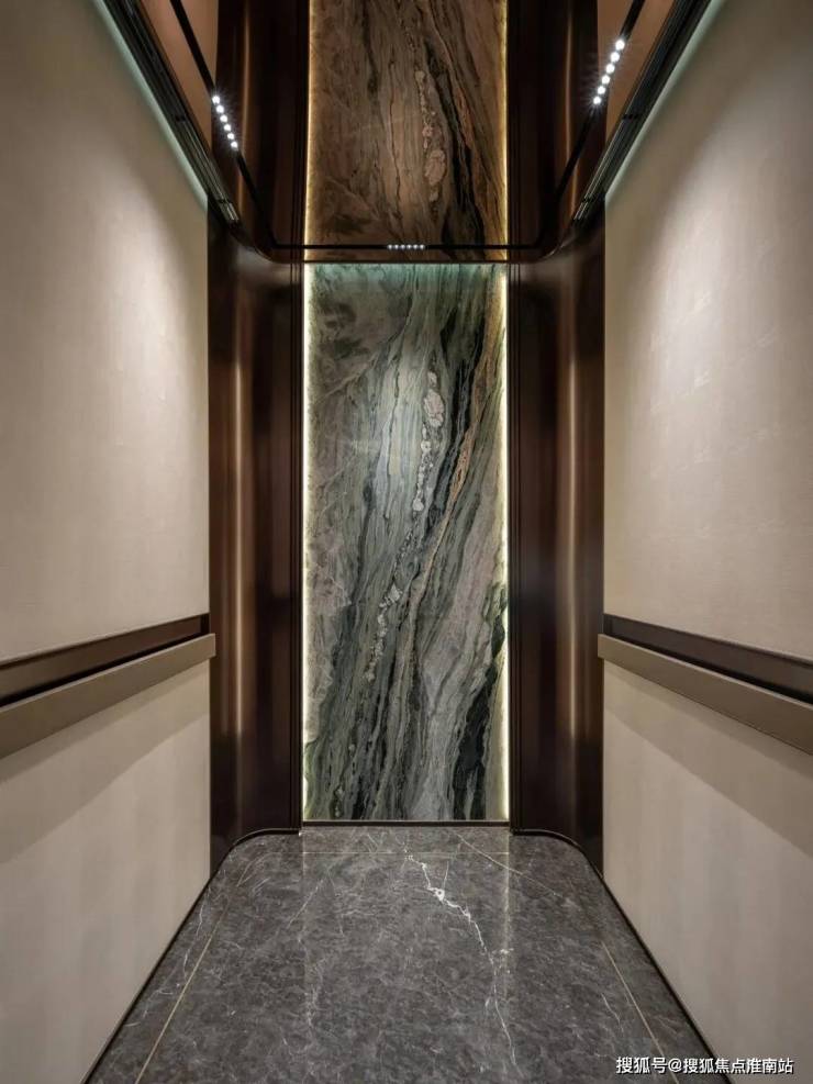 还有首层轿厢内电梯门也特别做了定制细节处理,使用金属蚀刻工艺不锈钢电梯门,高定专属纹案,近看能摸到细腻的凹凸质感;电梯厅内采用维多利亚绿奢石和温德姆灰石材打造,匹配类独厅设计的归家尊仪……奢石大量运用于公区,与超级豪宅相比都毫不逊色。