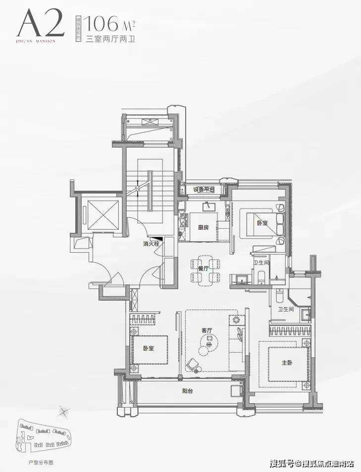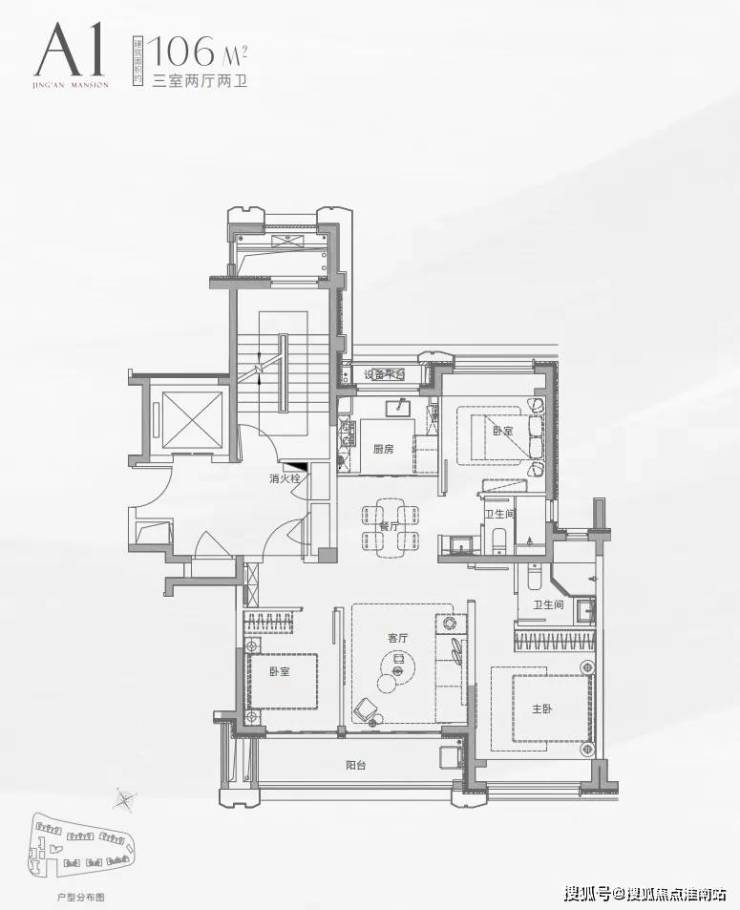 建面约106平三房两卫户型: