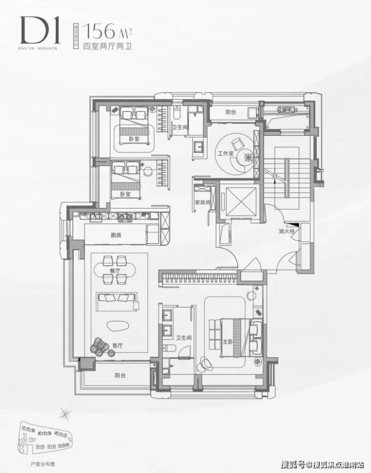建面约156平四房两卫户型: