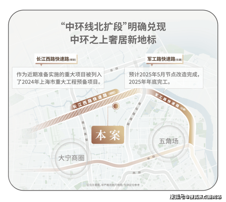 上海宝山招商序售楼处电话☎:400-9659-259(预约看房热线)中环线北扩段明确兑现,军工路快速路25年开工,长江西路快速路列入上海市重大工程清单预备项目,快速链通城心,随着中环线北扩段的政策明确,淞南将正式进入中环时间。未来经逸仙高架,进入南北高架、内环高架、中环高架,可快速链通南北上海;