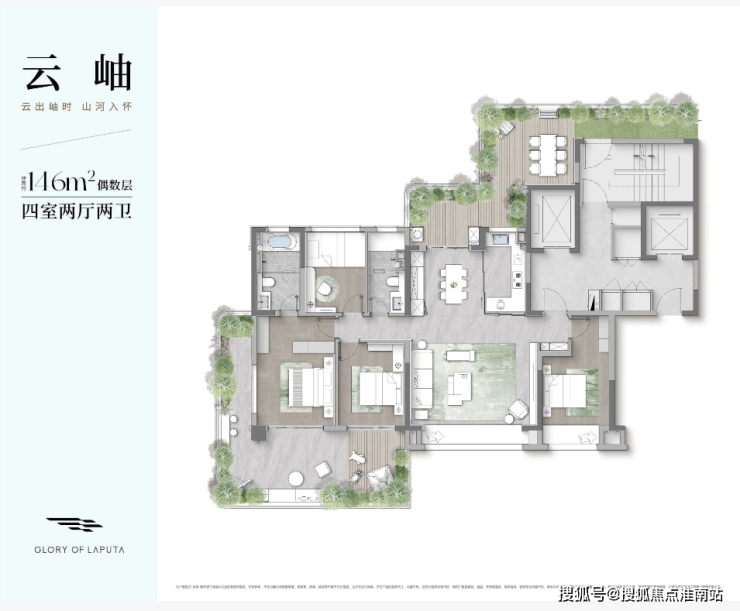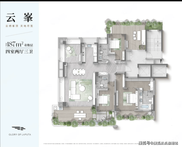 户型点评:4房2卫的房屋套型;偶数层南向超大L型空中庭院;四开间、三卧室朝南设计;偶数层北面有个北庭院;