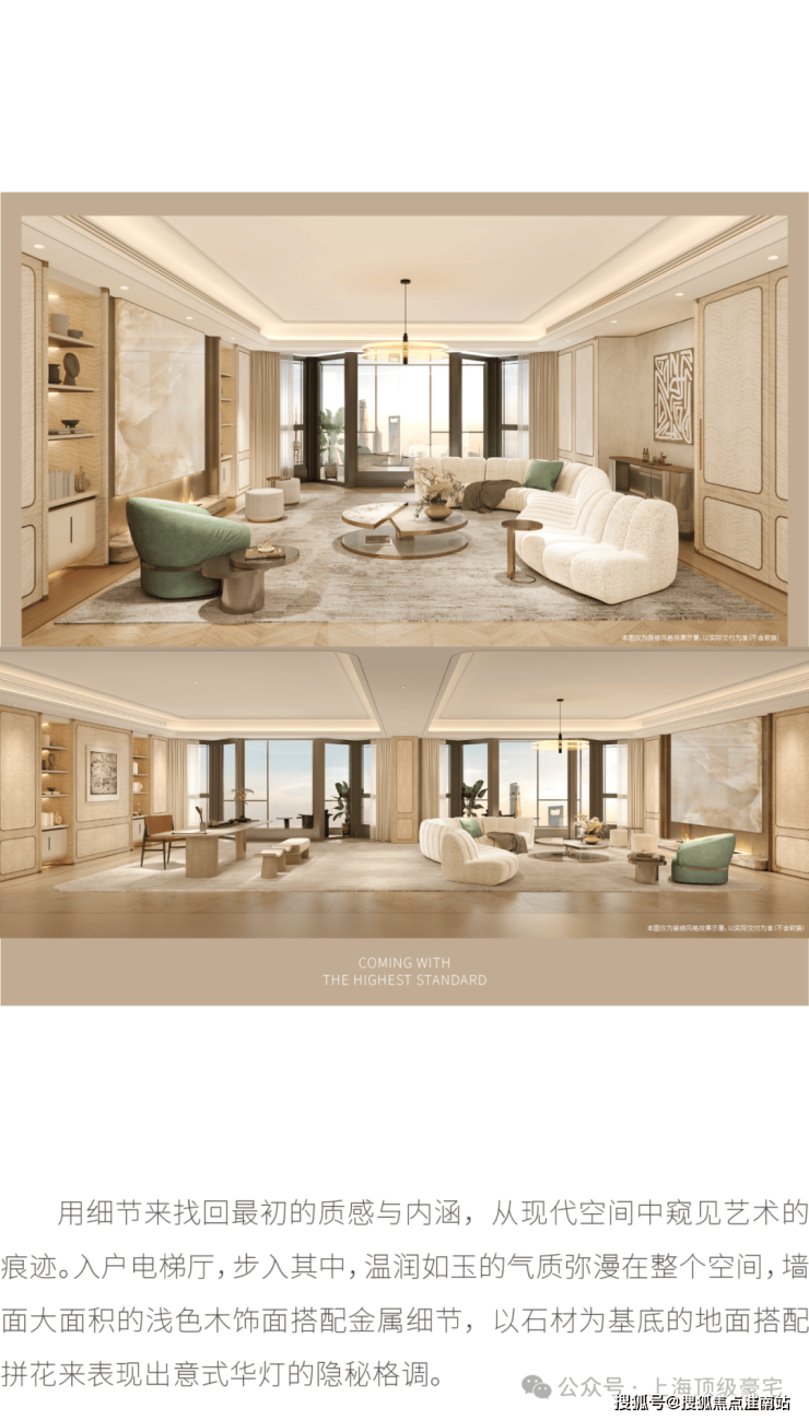 住宅部分全部大平层(复式)设计,单套面积约370-1500㎡,全部精装交付。