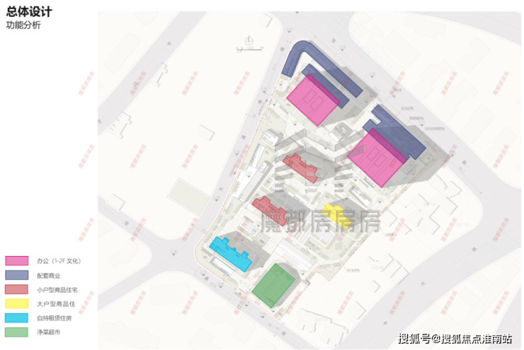 基地内需设置两栋办公楼、三栋商品住宅、一栋租赁住宅,此外基地内含5291平方米历史建筑,功能为配套商业及文化设施,含1958平方米文保点,功能为净菜超市及文化设置。