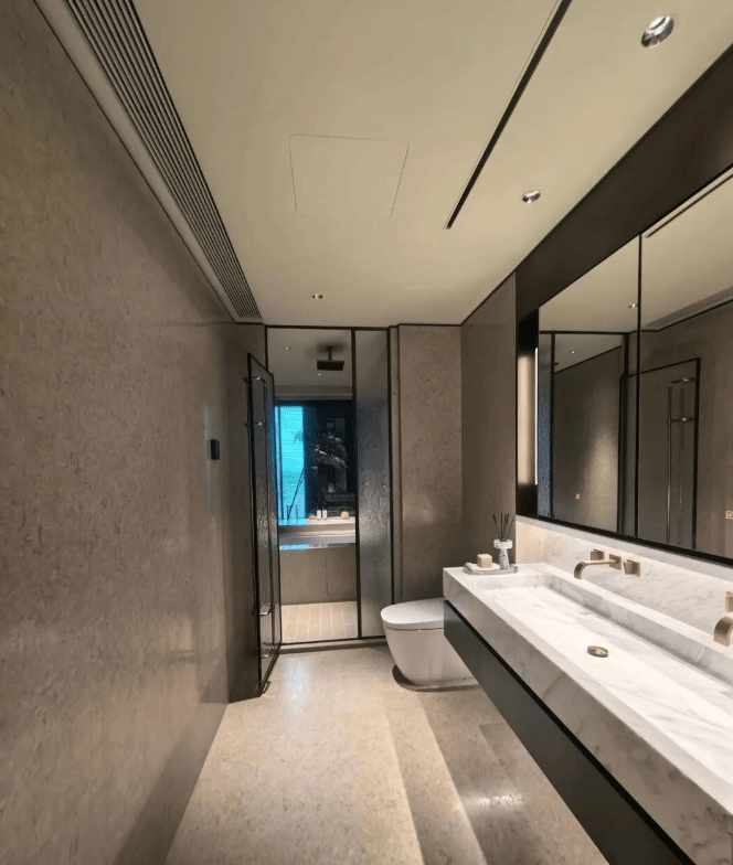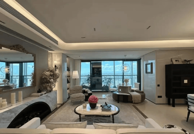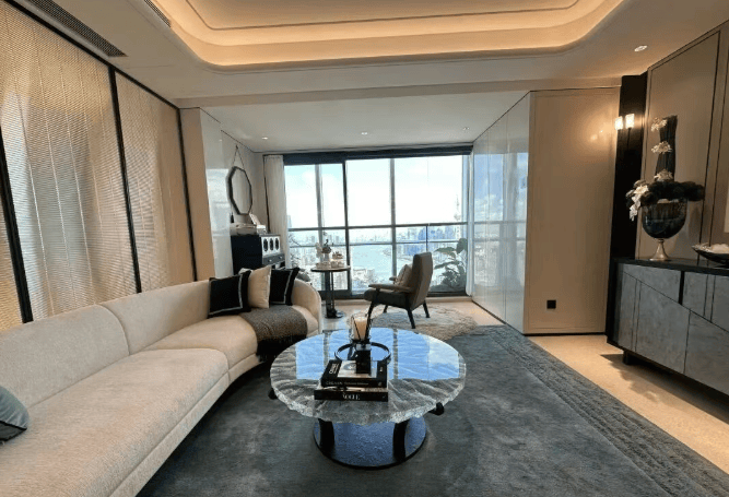 客厅以超大尺度惊艳亮相,若打通北向X空间,可拓展为约90㎡超级厅堂,家族宴请or高端社交,皆能轻松承载;约270°环幕视野将采光与观景效果推向极致,中高楼层可眺望陆家嘴三件套。