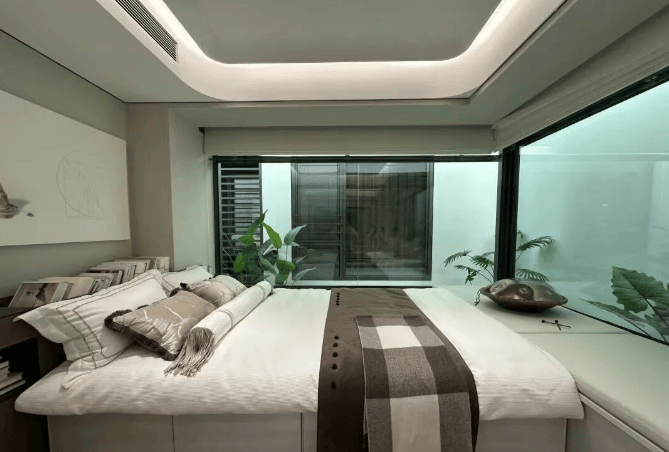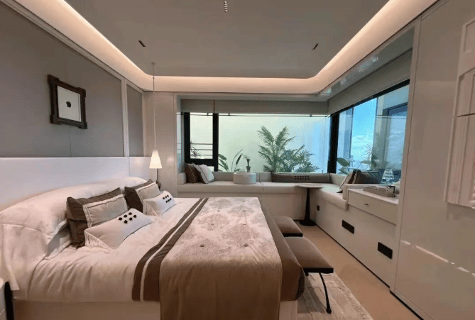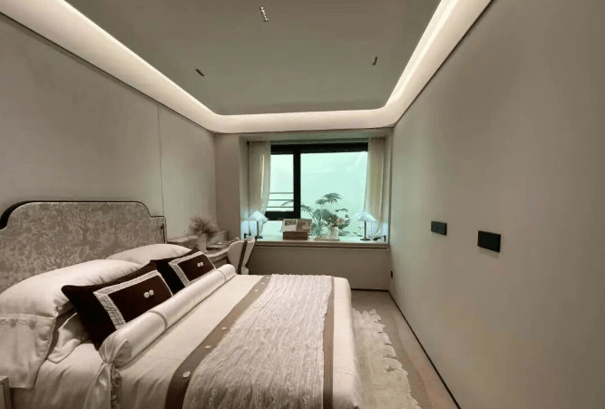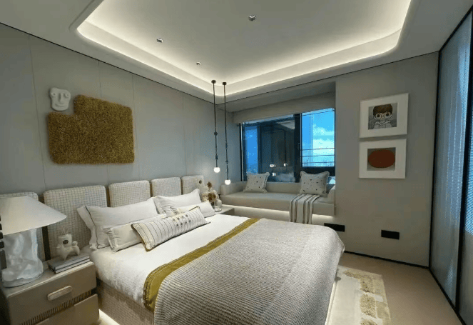 主卧背景墙更以威尼斯安缦酒店同款树瘤木,搭配巴黎宝格丽酒店同源羊皮纸,将全球顶奢酒店的居住质感搬进家中,每一处选材都彰显塔尖人居的高奢基因!