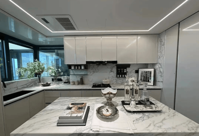厅内空间充裕,既容得下大家庭聚餐的超大圆桌,也有独立西厨岛台,满足高净值家庭多元烹饪需求。