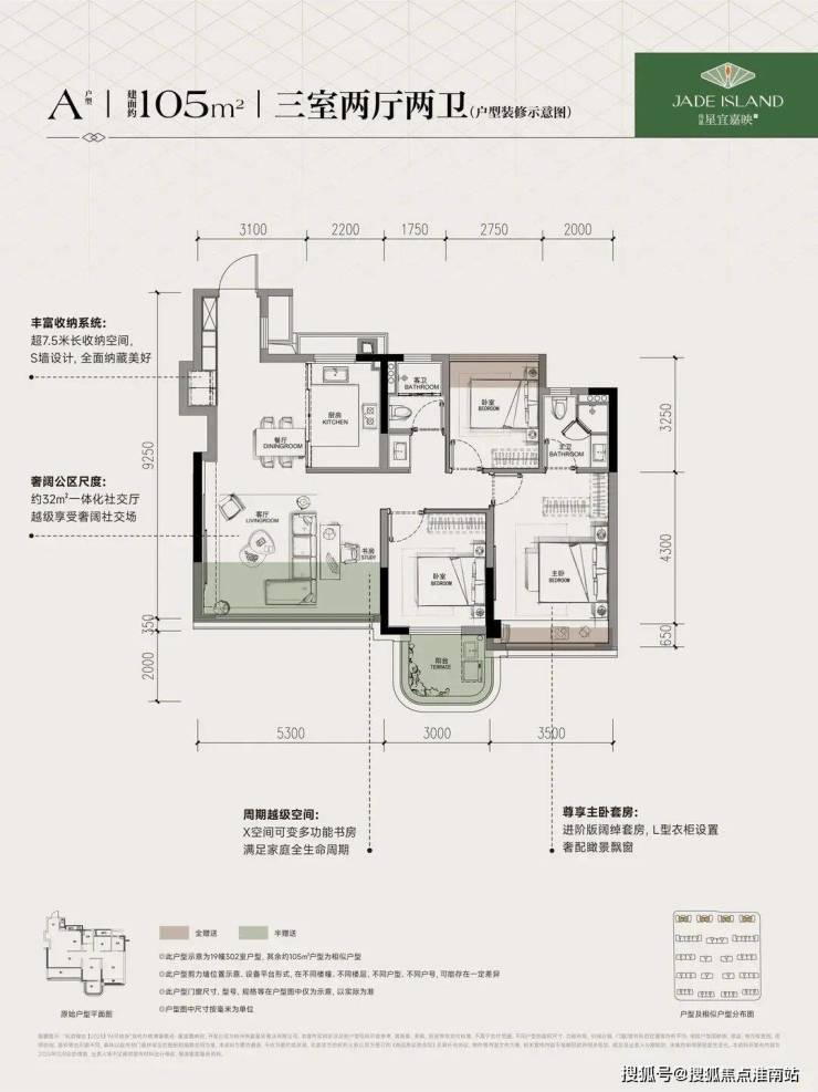 ❼建面约105㎡南厅户型,3房2厅2卫,含赠送得房率约93%。
